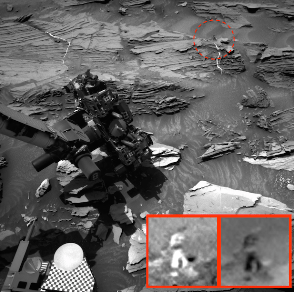 “With NASA set to announce a “major science finding” about Mars on Monday, a top online UFO expert has claimed that he recently discovered an ‘alien figure’ on the Red Planet’s surface, standing and patiently watching as the NASA Mars Curiosity Rover rolls by. In fact, the alleged alien shows remarkable calm in the photo — actually two photos — because at least according to the UFO researcher, the creature is only ‘three to four inches’ tall, meaning that this alien is lucky that the rover didn’t crush him.” (1)