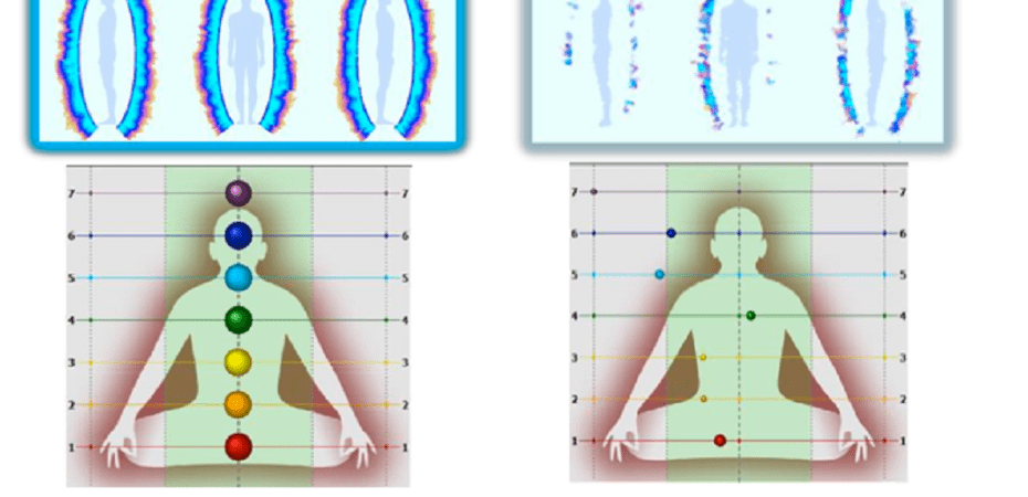 The aligned Chakras indicate that the subject was calm, relaxed and nourished from their participation in the case study, which involved information on meditation, breathing practices, love, kindness and intention. You can also observe a smoothing of the energy field before and after the case study work shop. Results like this were consistent with a number of volunteers.