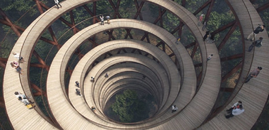 The innovative tree walkway is 2,000 ft. (600 meters) in length and will take nature enthusiasts 150 feet (or 45 meters) above the ground. Designed by EFFEKT, the walkway will offer a 360° view of the hilly landscape, which includes forests, lakes, creeks, and wetlands.