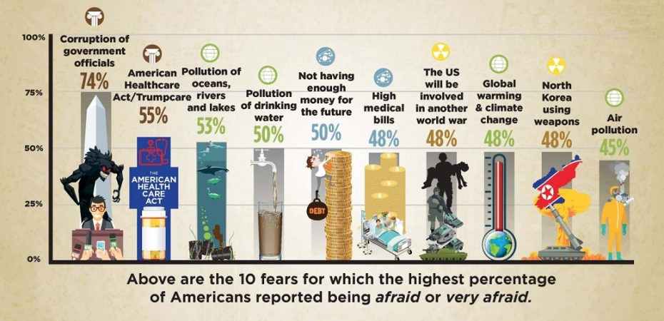 Are you scared of the government and all its corruption? A flunking economy or healthcare? Does your heart palpitate to the idea of a radioactive mushroom cloud, courtesy of North Korea? Do you agree that oceans are going to disappear leaving nothing but a gaping, chemical cesspool? Well, you’re not alone, and this chart proves it!