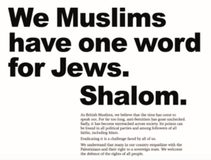 “As British Muslims, we believe that the time has come to speak out. For far too long, anti-Semitism has gone unchecked,” the ad continued. “Eradicating it is a challenge faced by all of us.