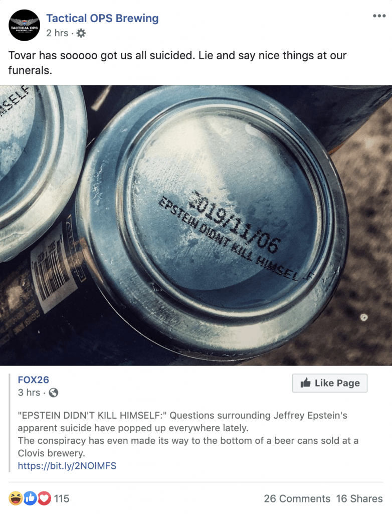 Tactical Ops Brewing in Fresno, California is printing the message “EPSTEIN DIDNT KILL HIMSELF” on the bottom of beer cans, according to local Fox affiliate KMPH.