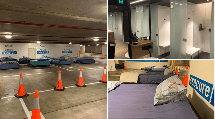 Such spaces include vacant office building parking lots. So Beddown partnered with major parking garage operator Secure Parking to launch a two-week trial in Brisbane where a parking garage is converted into a housing facility where homeless people can get some much-needed rest and refuge.